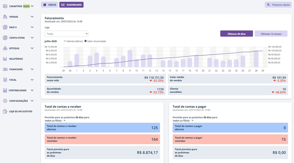 Controle o seu negocio com nosso sistema, emita documentos fiscais, pedidos, orçamentos, financeiro (Conta a receber e a Pagar), relatórios completos.